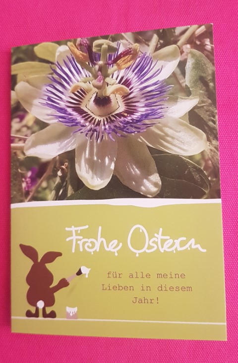 5 Osterkarten mit wunderschöner Passionsblume (Vorderseite) und Osterhasenmotiv