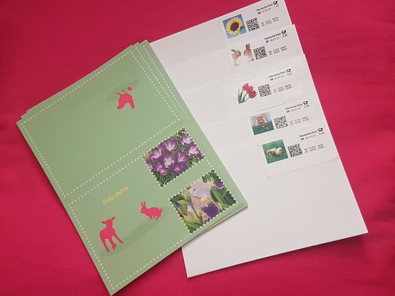 * mit 5 Briefmarken (Motive österlich gemischt) à 0,85 €, bereits geklebt, für plus 4,25 €