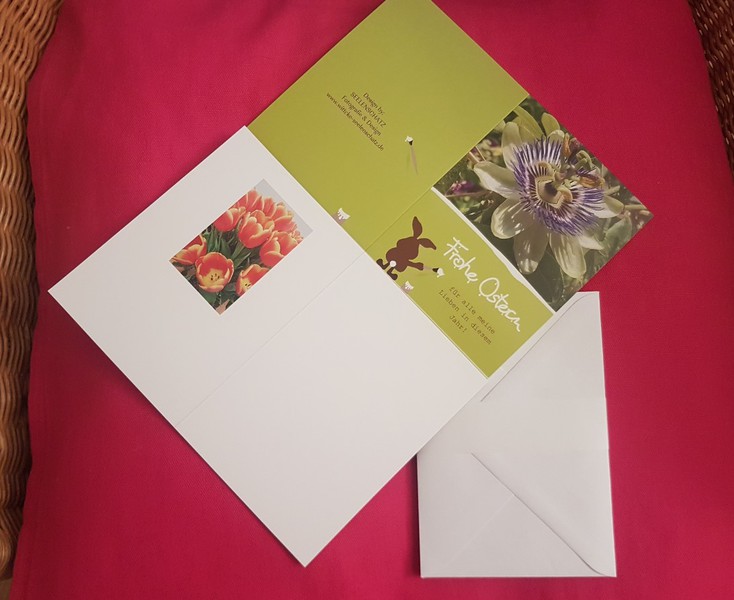 Je nach Wunsch Ihrer Bestellung haben Sie sie im freundlichen 5er-Pack unfrankiert oder auch schon mit österlichen Briefmarken versehen (0,85 €, Standardbrief) erhalten. Sie mussten nur noch Ihre Grüße an Oma Anna, Tante Luise oder ihre beste Freundin reinschreiben. Und ab die Post!